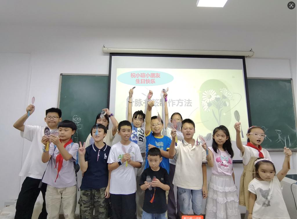 孩子们小心翼翼地顺着叶脉用软刷清理经过碱水处理的叶片肉质,随着轻轻的刷动,柔软叶肉逐渐脱落,留下清晰而坚韧的叶脉网络。这神奇的过程引得他们阵阵惊呼。“看!我的叶脉好像一棵小小的树!”“我的像地图上的河流!”在亲手实践中,抽象的生物知识化为了触手可及的奇妙结构。负责指导实验的党员志愿者苗苗表示,“制作叶脉书签,不仅能锻炼孩子们的动手能力和耐心,更能让他们直观地理解植物形态结构的精妙,感悟生命坚韧与智慧的力量。这枚自己亲手制作的书签,将是这个生日和国庆假期最独特的纪念品。”
