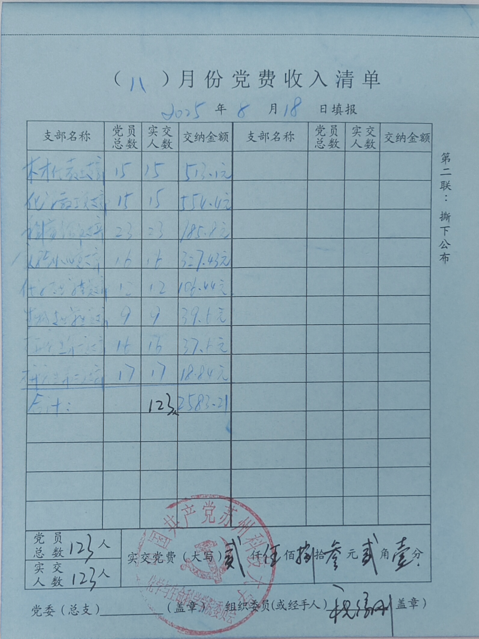 全院收到材化教工党支部、化学化工教工党支部、科普馆党支部、实验中心党支部、学生党支部123名党员交纳的8月党费共计2583.21元。