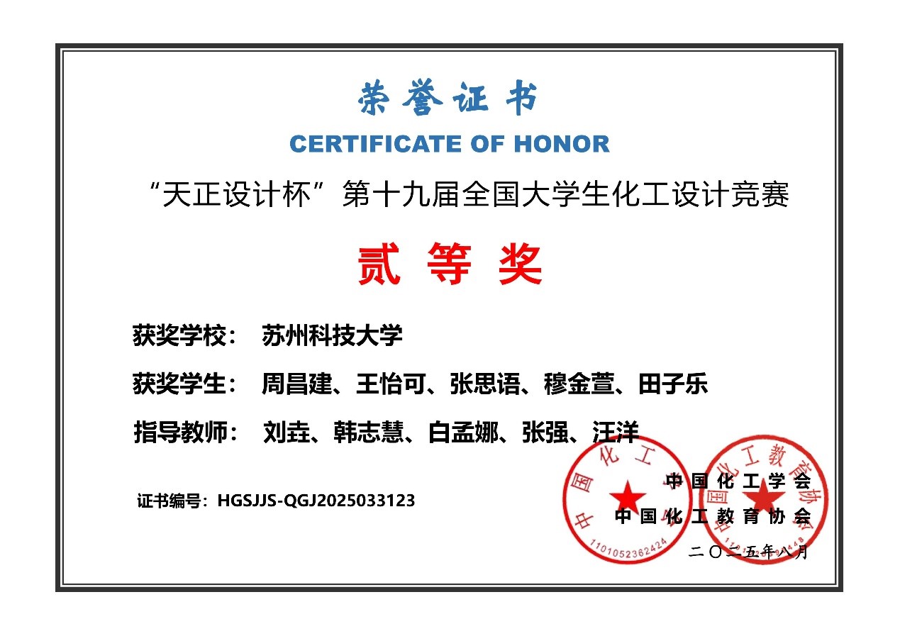 近日,中国化工学会、中国化工教育协会主办的第十九届“天正设计杯”全国大学生化工设计竞赛评选结果揭晓,我校7790必发集团应用化学专业田子乐、周昌建、王怡可、张思语、穆金萱同学获得全国赛二等奖,应用化学专业冯宇、叶振宇、王帅博、赵武、宋锦辉同学获得江苏省赛二等奖。